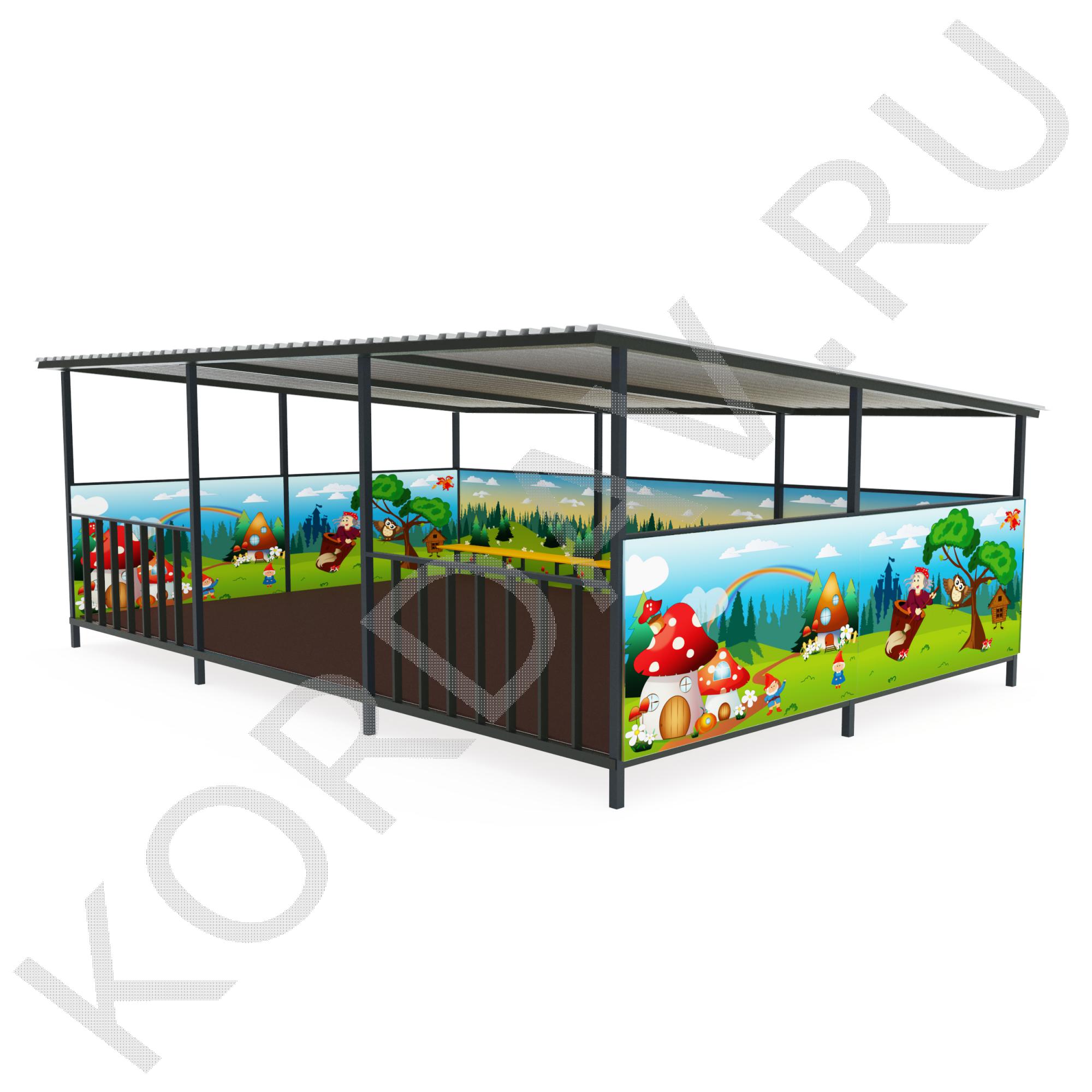 Теневой навес предназначен для установки на детских игровых площадках. Он является полностью разборной конструкцией, которая устанавливается с использованием резьбовых соединений. В собранном виде теневой навес представляет собой пространственную конструкцию в форме домика с односкатной крышей.